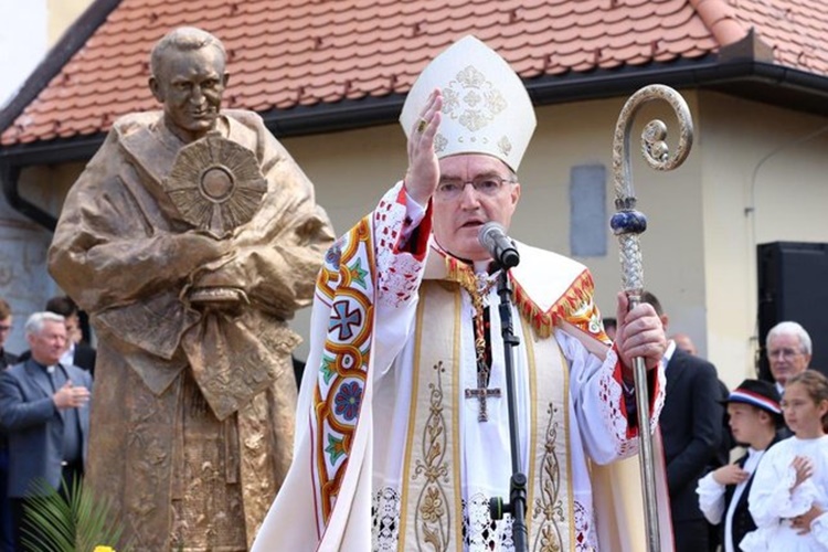 Brončani spomenik kardinala Franje Kuharića, visok 2,2 metra, rad je akademskog kipara Tomislava Kršnjavog.